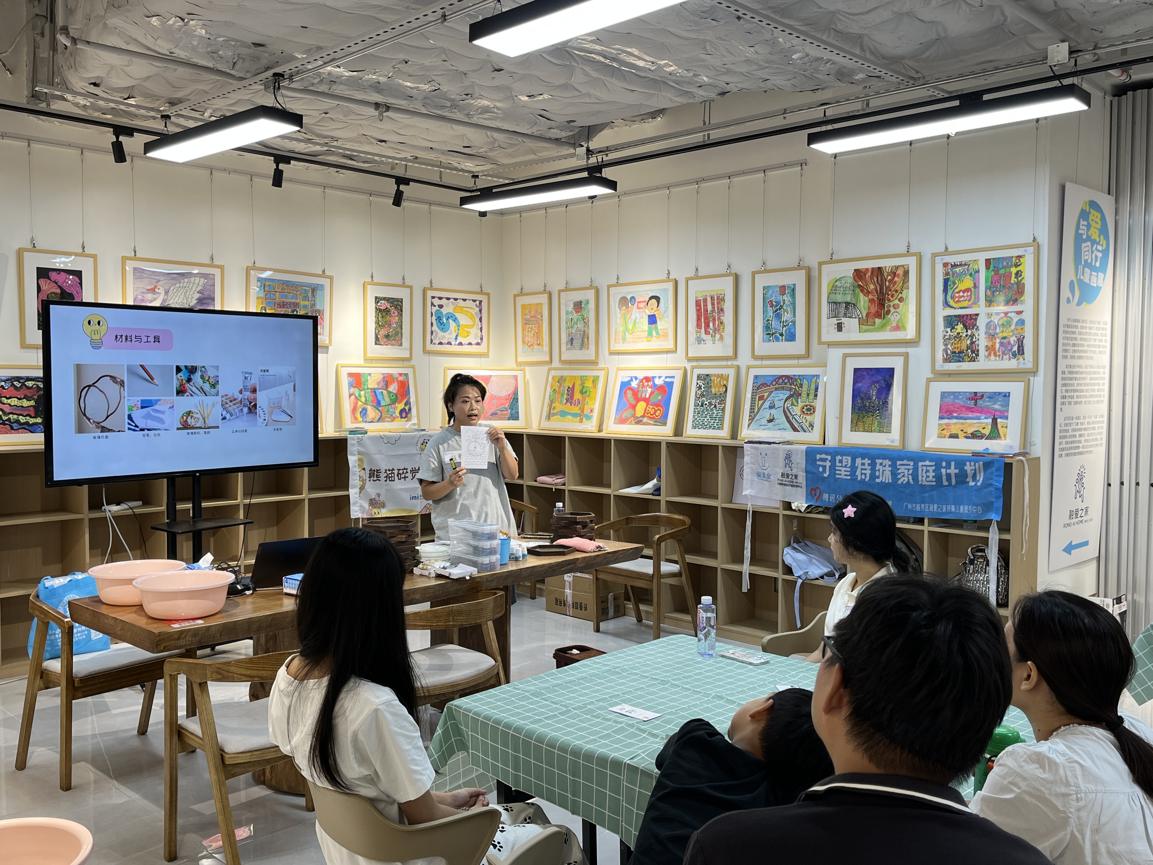 8月24日,在学生志愿者马智渊同学的暖心支持下,广州市越秀区融爱之家特殊儿童服务中心携手欧弗教育、熊猫碎觉·星绘行动团队、喜邻里,共同举办了一场家庭融合·亲子艺术疗愈——“海洋世界”玻璃彩绘活动。8位学生志愿者陪伴8组特需家庭共同体验玻璃彩绘的魅力,这一刻,艺术不再是遥望的风景,而是握在手中的光,照进每一个特需儿童与家庭的心里。